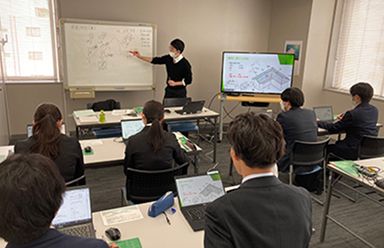 その後、ビジネスマナー、製品や技術の概要、ソリューション営業の基礎などを座学形式で学びます。